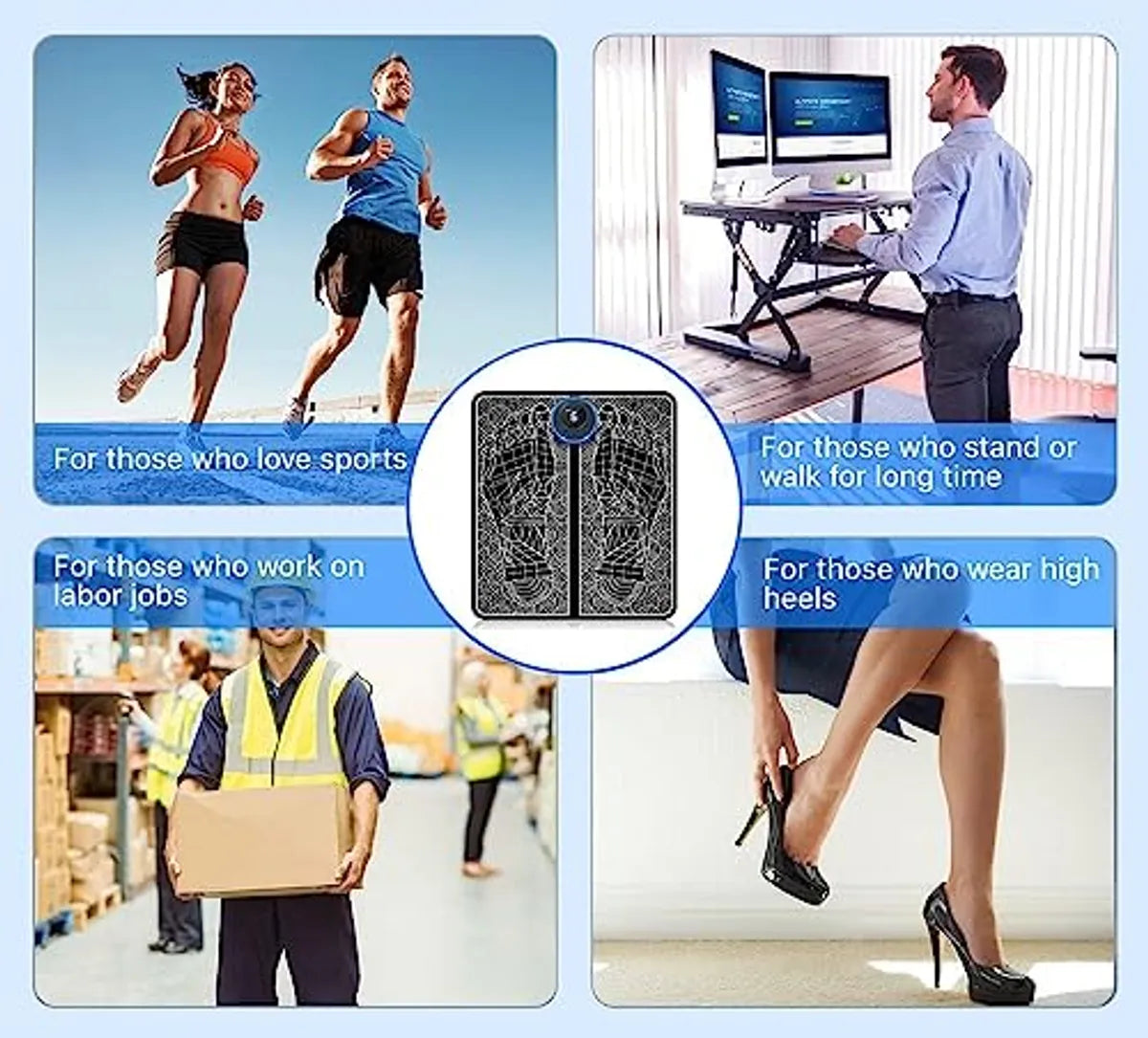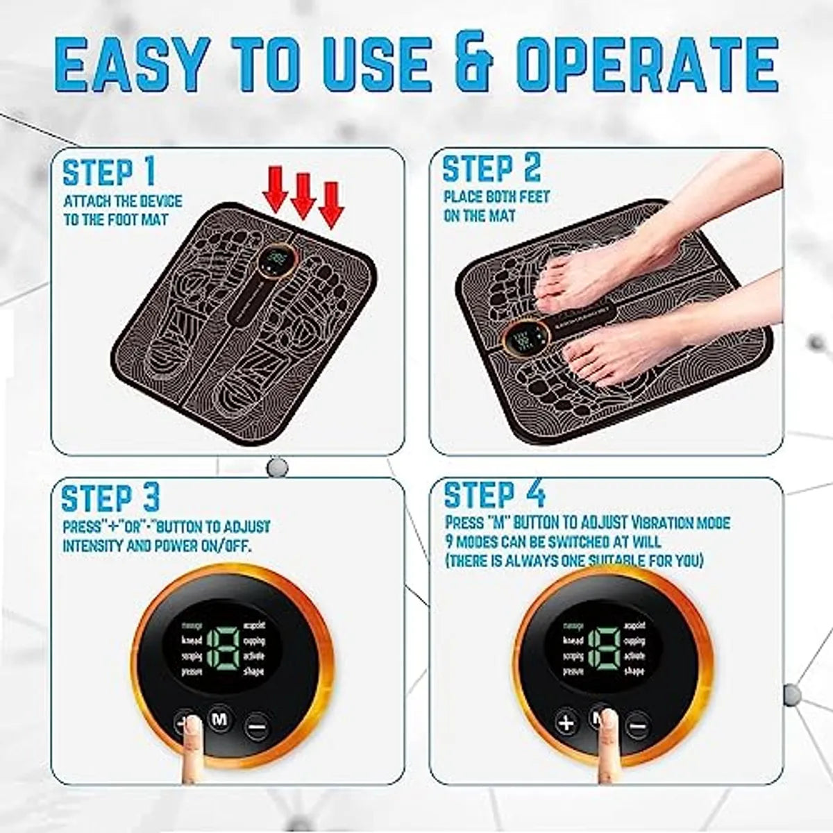 The EMS stimulator is suitable for elderly people, people with swelling and pain in their legs or younger people who just want a relaxing foot massage.